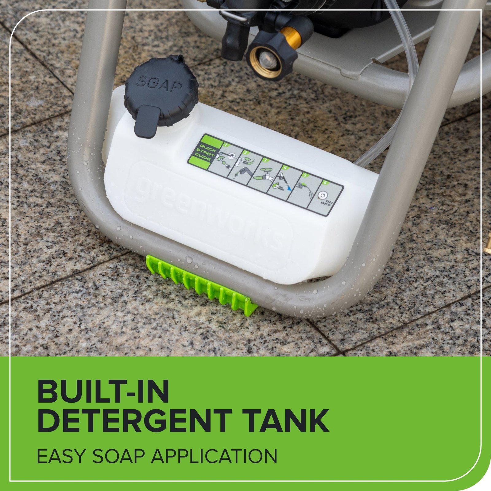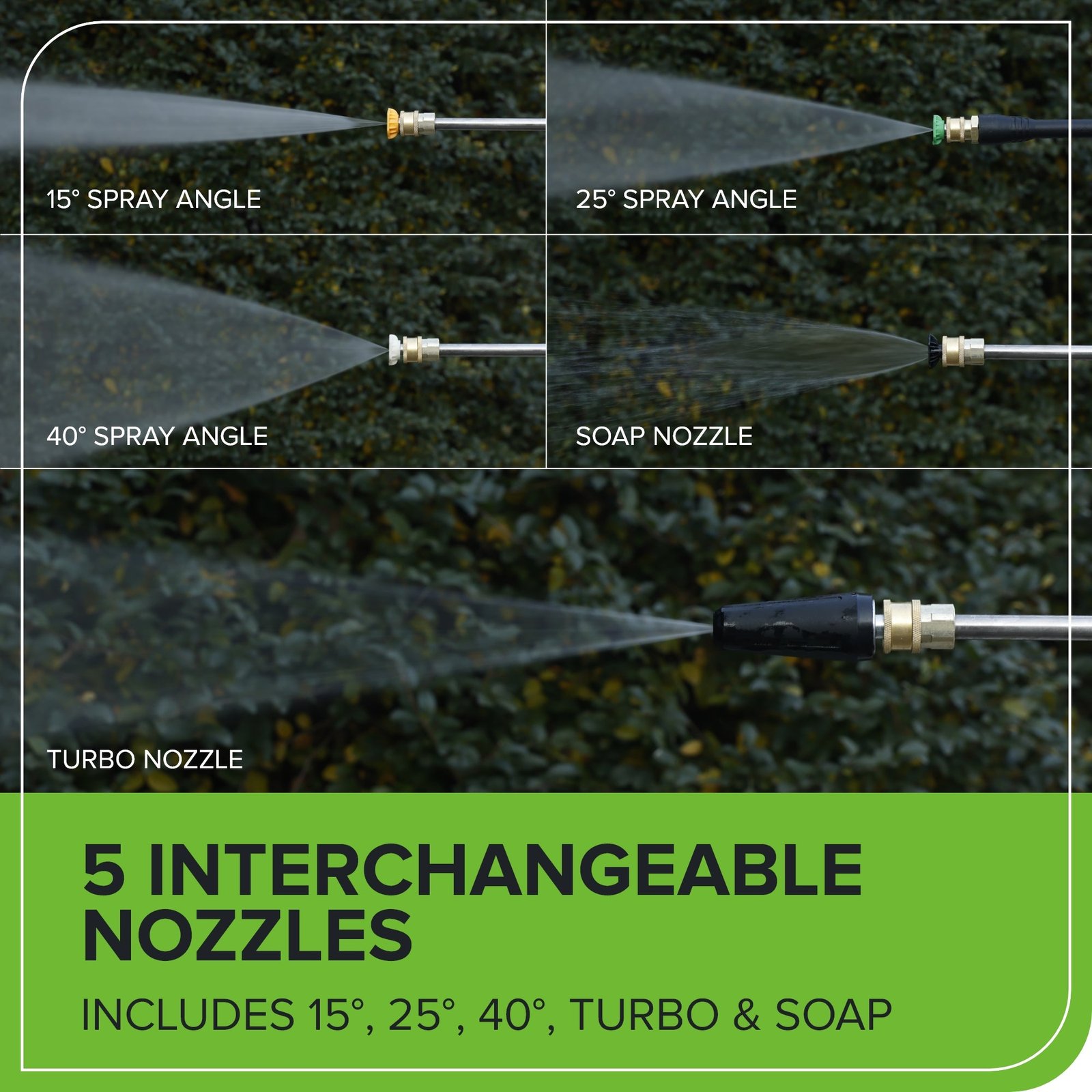 - 5 Nozzles Included: 15°, 25°, 40°, Soap, and Turbo