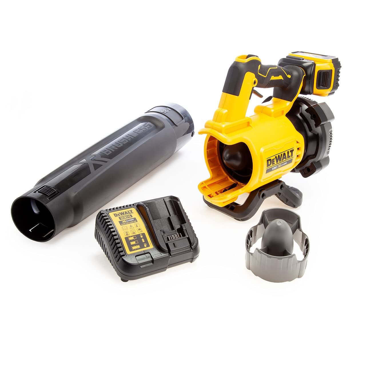 Details: The DEWALT DCMB562 XR Brushless Axial Blower delivers fast, efficient clean-ups, both indoors and outside. Its brushless motor has been designed to run cooler and more efficiently, enabling more power to be delivered during applications, resulting in less wear and increased longevity of the tool. The Aerospike Concentrator focuses airflow and increases speed for maximum productivity. It also doubles as a robust scraper, effectively removing impacted leaves, moss, mud, grime and other embedded matter. This versatile and powerful cordless blower will be welcomed by an array of professional users including construction teams, carpenters, metal and woodworkers, gardeners, landscapers, park clean-up workers and clearance specialists. Specification: Max. Air Speed: 200km/hr. Weight: 3.6kg The DEWALT DCMB562P1 XR Brushless Axial Blower is supplied with: 1 x 18V 5.0Ah Li-ion Battery 1 x 18V Charger