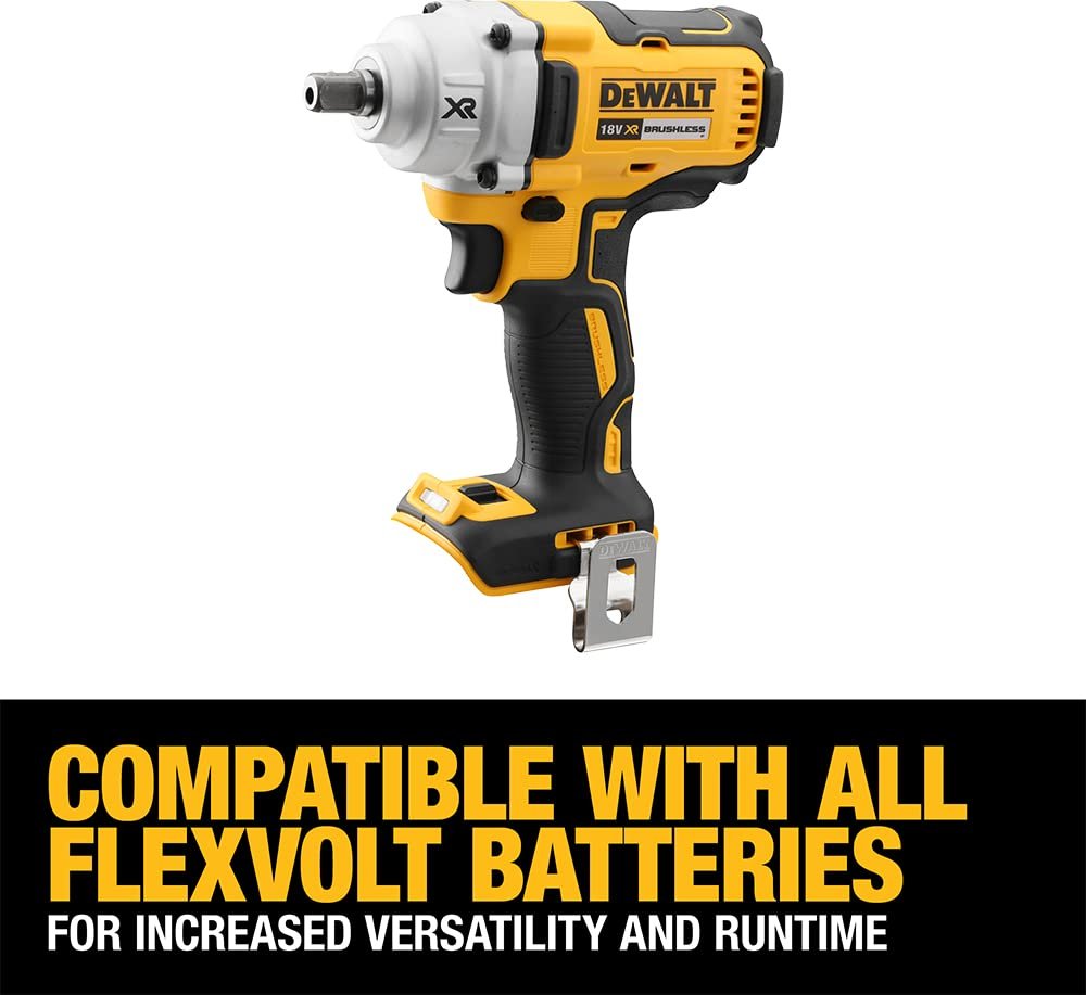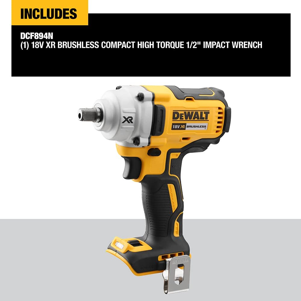 Details: The DeWalt DCF894N 18V XR Brushless 1/2in Compact High Torque Wrench delivers up to 330 ft-lbs max of fastening torque and a lightweight, ergonomic design. This tool also features Precision Wrench™ Control, which helps to prevent overtightening in forward and fastener run-off in reverse. This Mid-Range Cordless Impact Wrench is ideal for grooved couplings, pipe flanges, wheel lugs, concrete anchor setting, and many other applications where a lot of torque is needed in a compact space.Features and BenefitsBrushless mottor delivers durable power with an excellent runtimeCompact, lightweight design for enhanced comfortBlet hook enables temporary storage, keeping your hands freeSuper Bright LED – On the foot to avoid shadow, casts light at the point of applicationTechnical Specification:Anvil Size: 1/2″Impacts/Min: 0-3100 IpmMax Torque (ft-lbs): 330 ft-lbsNo Load Speed: Low: 0-900 High: 0-2000System: 20v Max*Tool Height: 8.25 inTool Length: 6.95 inTool Width: 2.85 inTool Weight: 1.5 kgSupplied With:1 x DeWalt DCF894N 18V XR Brushless 1/2in Compact High Torque Wrench KitBare Tool – No Battery or Charger Included