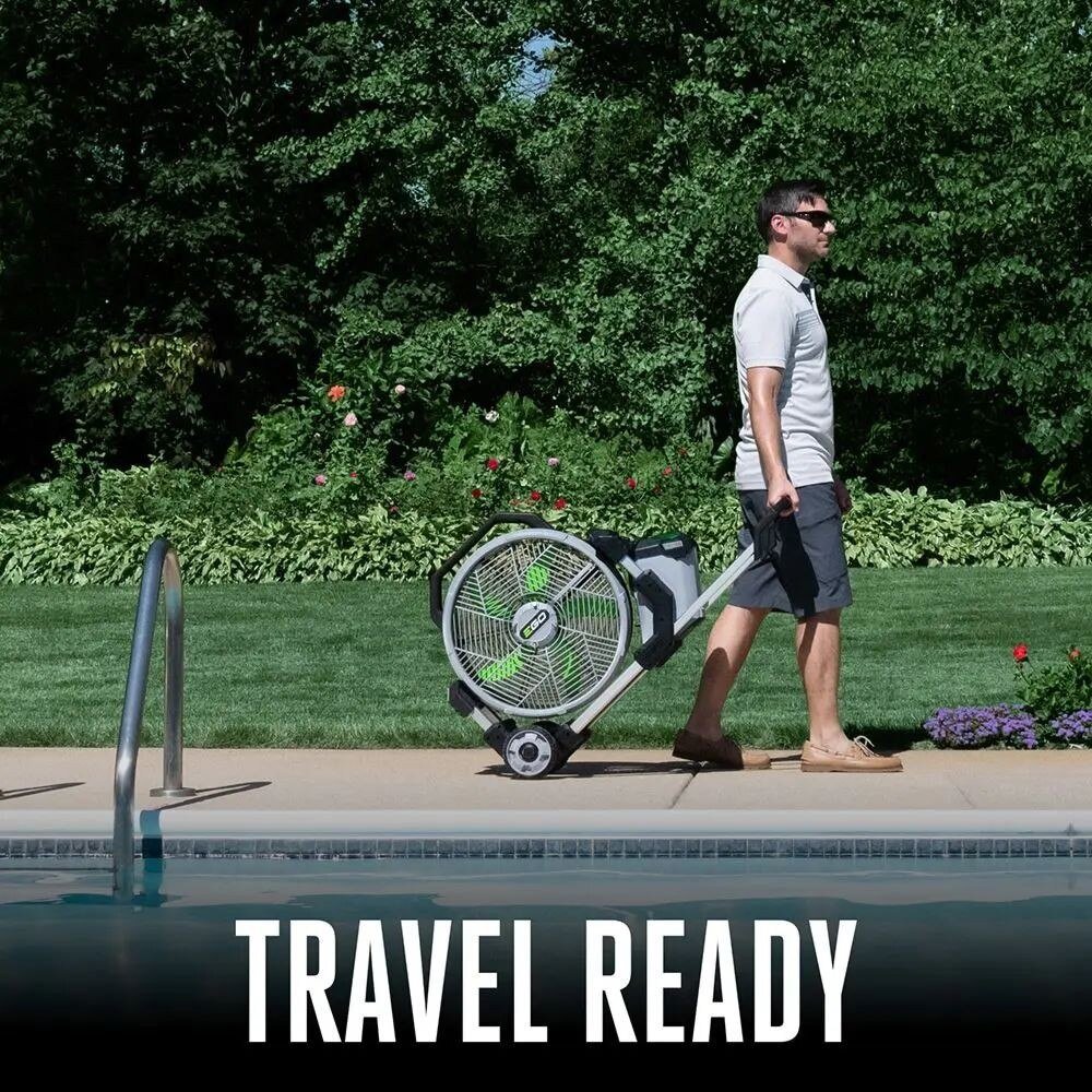 Introducing the EGO POWER+ 18” Misting Fan, the world’s most powerful cordless misting fan. With air speeds of over 20MPH, this fan has double the airflow of a standard 20” box fan. 5 different speed settings allow you to adjust air flow to your liking from 1,500CFM to 5,000CFM for ultimate control. With its telescopic handle and durable wheels, take advantage of superior portability. Bring the POWER+ 18” Misting fan to sporting events, tailgates, beach days, patio hangouts, and more! Ideal for cooling down indoor and outdoor environments with quiet operations of just 42dB on speed 1. Simply drop the intake filter in a bucket and select from 2 misting modes to cool down an area equivalent to a large entertainment patio (540 square feet). Stay cool longer with up to 60 hours of run time (on speed 1 with the recommended 5.0Ah ARC Lithium™ battery, available separately). Compatible with all EGO POWER+ ARC Lithium™ batteries (available separately) to deliver Power Beyond Belief™.