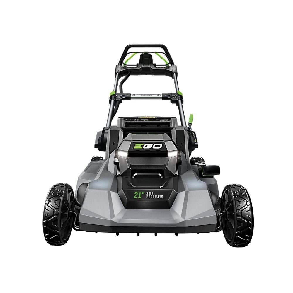The EGO POWER+ 21” Self-Propelled Mower delivers 6.0 foot-pounds of cutting torque—power that exceeds gas without the noise, fuss, or fumes. Its high-efficiency brushless motor delivers long runtimes, low vibration, and lifelong durability. Engage the self-propel system with either hand using the dual levers, and make speed adjustments with the dial at your fingertips. This cordless lawn mower delivers up to 50 minutes of run time on a single charge with the recommended 56V 6.0Ah ARC Lithium™ battery (available separately). The lawn mower delivers precision cutting with its advanced mulching blade and seven cutting height positions from 1.25 to 4 inches, adjustable with one hand. Three-in-one functionality delivers your choice of mulching, side discharge, or bagging your grass clippings; an easy-access two-bushel grass collection bag is included. This electric lawn mower includes bright LED lights for added visibility when mowing at dawn or dusk, and it folds flat for compact storage between cuts. Experience Power Beyond Belief™ with the EGO POWER+ 21” Self-Propelled Lawn Mower.