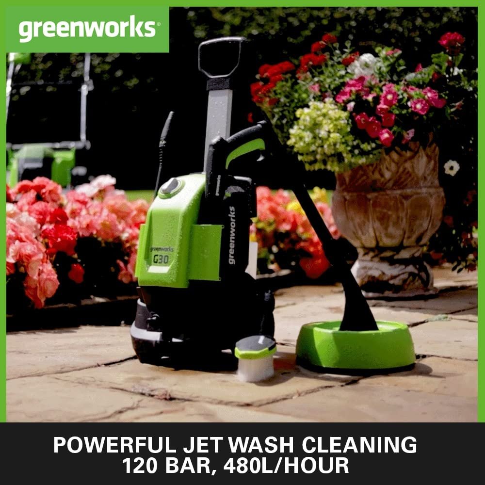 Details: GW G30 pressure washer kit with patio cleaner, brush, turbo nozzle and vario nozzle