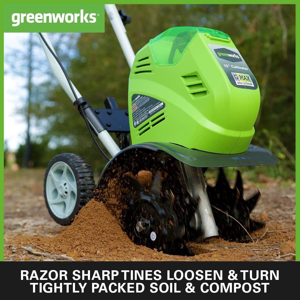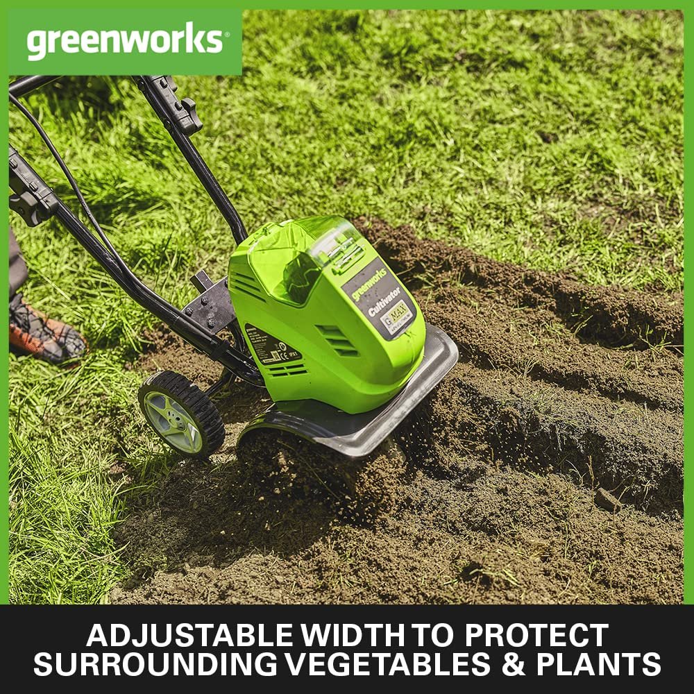 Greenworks G40TL (Li-Ion 40V battery-powered tiller with specially hardened 4 blades working depth 20cm working width 26cm without battery and charger). Turn the strenuous job of digging up your garden soil into a breeze with the Greenworks hoe. You can easily and effortlessly prepare your soil to clear it of weeds and then replant it. The Greenworks tiller is equipped with a powerful electric motor and 4 metal hoeing stars that undergo a special hardening process to ensure extra strength and durability. The garden hoe has a particularly low noise level for power-saving soil loosening in the home garden, beds and raised beds or allotments. Four high-quality and robust metal hoeing blades penetrate the soil independently and ensure smooth running when hoeing. In addition, rubberised anti-vibration gripping surfaces ensure a safe and comfortable grip. A safety lock prevents children or other unauthorised persons from using the motor hoe. The well-balanced design ensures a comfortable weight distribution and, together with a belt clip for cable routing and strain relief, makes the tiller easy to operate. In addition, manoeuvrable wheels that can be adjusted in height without tools ensure easy manoeuvring. The blades penetrate up to 20 cm deep into the soil. The working width of the soil hoe is 26cm. For an optimum result we recommend a battery with at least 4Ah. The battery cultivator has full power thanks to the lithium-ion battery.ONE BATTERY FOR ALL! Our 40V batteries are available with 2Ah 2.5 Ah 4Ah or 6Ah and are compatible with many other products from Greenworks Tools in the garden and workshop. So you have an infinite radius of action and no more danger of stumbling over annoying cables during garden work. The LEDs built into the batteries indicate the remaining battery charge at the touch of a button. Technical data at a glance: Working width: 26cm ; Working depth: 20cm ; Battery power: 40V; Weight: 13,3kg. Scope of delivery: Battery cultivator without battery and charger.