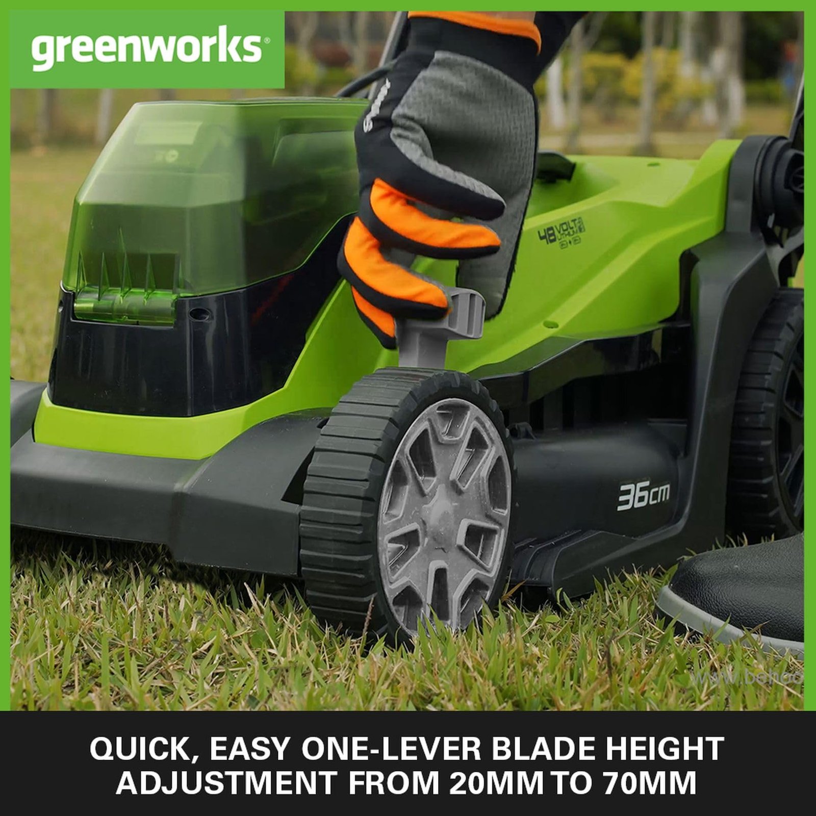 Details: Greenworks battery lawn mower G24X2LM36 (Li-Ion 2x24V 36cm cutting width up to 250m 40l grass catcher 5-fold central cutting height adjustment without battery and charger). Every garden has its nooks and crannies that are difficult to reach, here are garden tools with battery very helpful and the best part, the Greenworks 24V battery 2Ah and 4Ah is compatible with all devices of the Greenworks 24V program. Versatile battery garden tool – the lawn mower: With our lawn mower, you can mow small to medium-sized gardens with an area of up to 250m – for a well-kept lawn. In addition, the mower has a 5-fold central cutting height adjustment of 20-70mm, as well as a cutting width of 36cm. For space-saving storage, the handle of the lawn mower can be folded; the mower is equipped with a grass catcher capacity of 40 liters. The lawn mower has full power thanks to the lithium-ion battery. ONE BATTERY FOR ALL! Our batteries 24V are available as 2Ah or 4Ah battery and compatible with many other products from the house Greenworks Tools in the areas of garden and workshop. Thus, you have an infinite radius of action & no more risk of tripping over annoying cables while gardening or even cutting the cable. The LEDs built into the batteries indicate the remaining battery charge at the push of a button. Technical data at a glance: Cutting width 36 cm ; catch basket 40L ; 36 cm steel blade with effective motor protection ; 5-stage cutting height adjustment from 20-70mm ; up to 250m mowing area ; foldable handle for space-saving storage ; safety start key ; battery power: 2X24V ; weight: 18kg. Scope of delivery: lawn mower G24X2LM36 without battery & charger