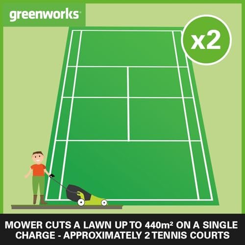 - USE WITH TWO OF GREENWORKS 24V 2Ah or 4Ah BATTERIES – this is a special ‘tool only’ package that comes without batteries. Choose two 2Ah batteries to cut lawns up 220m² or two 4Ah batteries to cut lawns up to 440m²