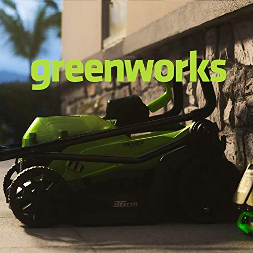Details: Greenworks Battery Lawnmower GD24X2LM36K2x (Li-Ion 2x24V 36cm cutting width up to 250m² 40L grass catcher 5-fold central cutting height adjustment with 2x2Ah battery and dual slot charger) Every garden has its nooks and crannies that are hard to get to, so cordless garden tools are very helpful and best of all, the Greenworks 24V 2Ah and 4Ah battery is compatible with all Greenworks 24V range tools. Versatile battery gardening tool – the lawn mower: With our lawn mower, you can mow small to medium-sized gardens with an area of up to 250m² without streaks – for a well-kept lawn. In addition, the mower has a 5-position central cutting height adjustment of 20-70mm, as well as a cutting width of 36cm. For space-saving storage, the handle of the lawn mower, which is equipped with a grass catcher capacity of 40 litres, can be folded away. The lawn mower has full power thanks to the lithium-ion battery. ONE BATTERY FOR ALL! Our 24V batteries are available with 2Ah or 4Ah and are compatible with many other products from Greenworks Tools in the garden and workshop sectors. This means you have an infinite radius of action and no more risk of tripping over annoying cables while gardening. The LEDs built into the batteries indicate the remaining battery charge at the touch of a button. Technical data at a glance: Cutting width 36 cm ; collecting bucket 40L ; 36 cm steel blade with effective motor protection ; 5-stage cutting height adjustment from 20-70mm ; up to 250m² mowing area ; foldable handle for space-saving storage ; safety start key ; battery power:2x 24V ; weight: 18kg. Scope of delivery: lawn mower GD24X2LM36K2x with 2x 2Ah battery and dual slot charger
