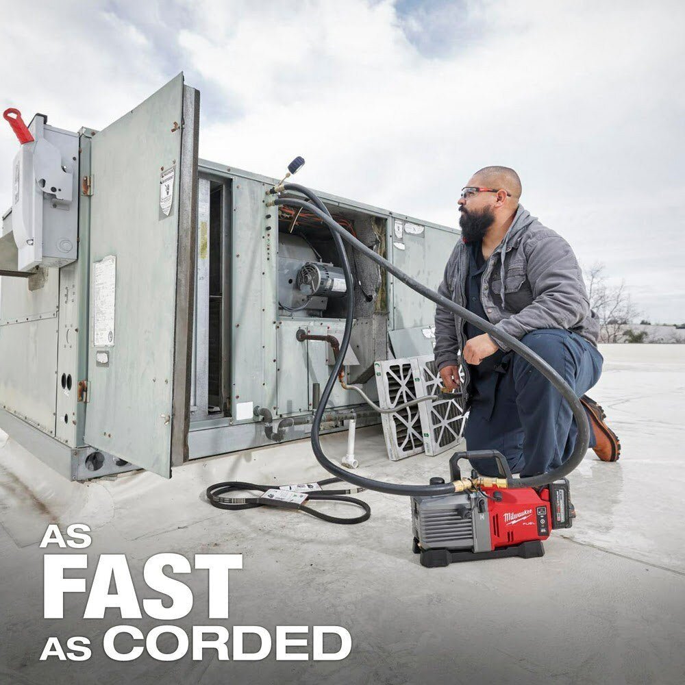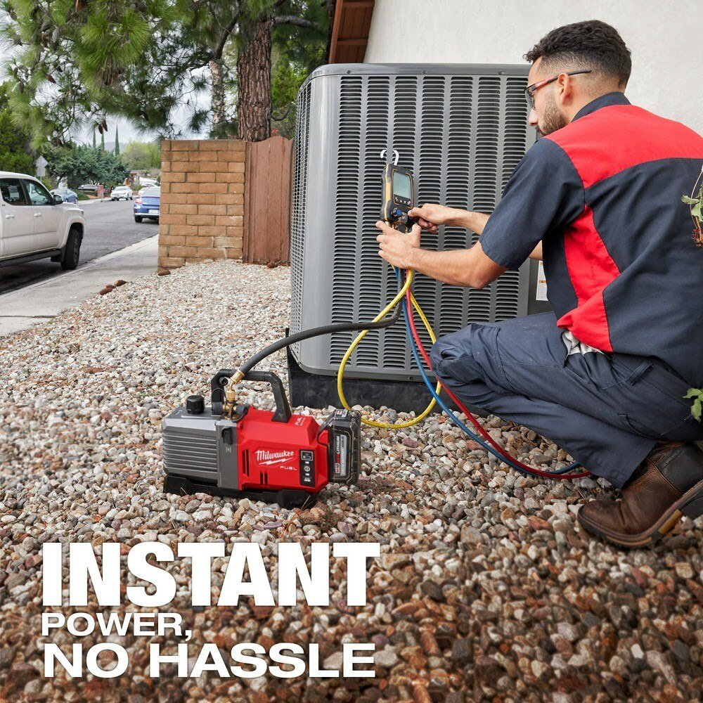 The MILWAUKEE M18 FUEL 5 CFM Vacuum Pump eliminates the hassle of cords and provides instant power for fast evacuations. Powered by M18 REDLITHIUM, this pump delivers the runtime to complete multiple jobs on one charge. With the innovation of manifold mode, the M18 FUEL 5 CFM Vacuum Pump allows you to maximize your speed and runtime in manifold setups, enabling up to 90 minutes of runtime per charge. This compact vacuum pump features a POWERSTATE Brushless Motor to enable corded speed during system pulldowns. The pump’s 1/2″, 3/8″, and ¼” port offerings deliver fast evacuations, especially when used with large hoses. The M18 FUEL 5 CFM Vacuum Pump is equipped with REDLINK PLUS Intelligence to ensure maximum performance and protection from overload.