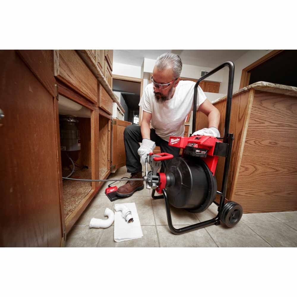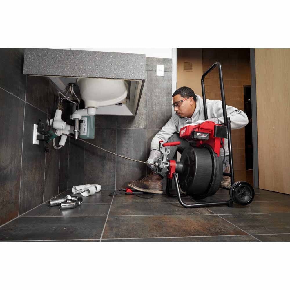 The MILWAUKEE® CABLE DRIVE™ Assembly for the M18™ Drum Machine (48-53-2816) provides you with the ability to automatically feed and retract cables through 1-1/4” to 4” lines at up to 15-20 feet per minute. The ratcheting lever automatically adjusts for the MILWAUKEE® 3/8″ and 1/2″ inner core drain cleaning cables. The RAPID STOP™ release of the steel bearings provides a quick way to release the cable once the blockage is reached, preventing the cable from binding. The twist-lock feature allows the CABLE DRIVE™ Assembly to be easily swapped between your drums for maximum efficiency.