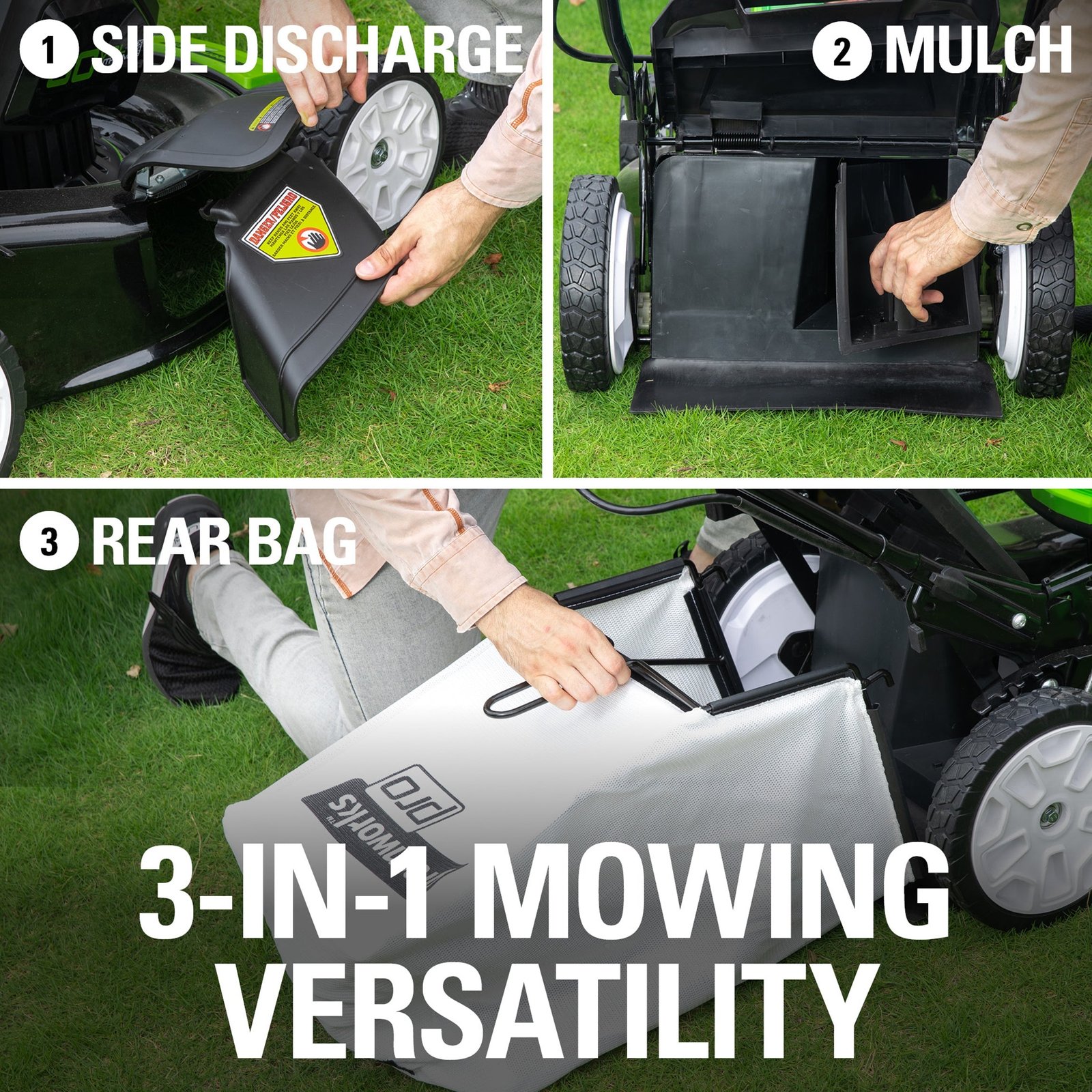 - 3-in-1 System: Mulch, Bag, Side Discharge